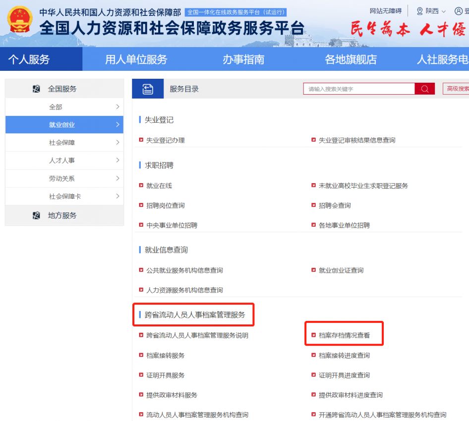 注册并登录全国人社政务服务平台(https://www.12333.gov.cn/),点击“就业创业”板块,在“跨省流动人员人事档案管理服务”中即可查看档案存档情况。